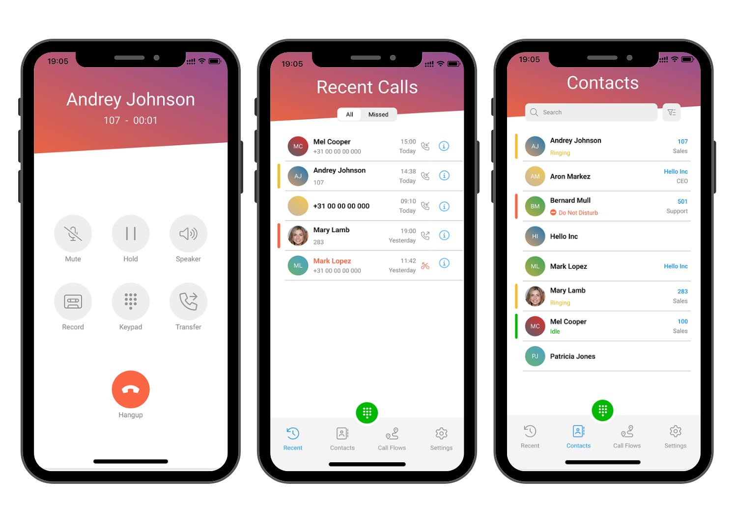 - Oproepstatussen - tijdens het gesprek kan een gebruiker de status van het gesprek zien: Overgaan, Verbonden, Beƫindigd, enz.
