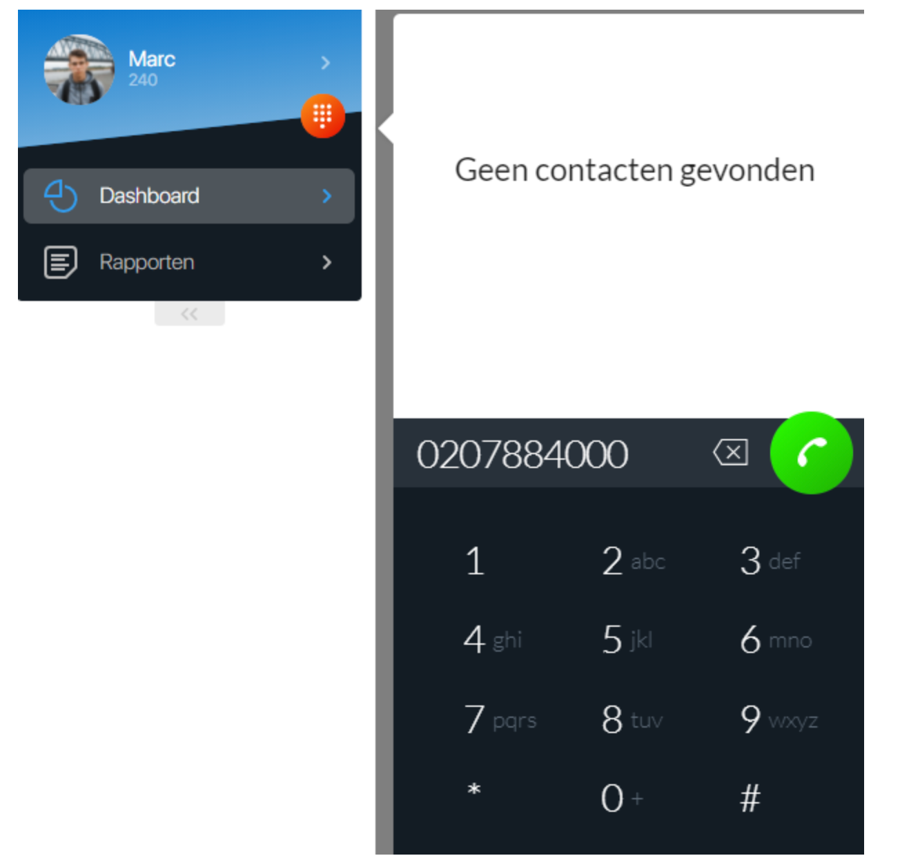 Om een uitgaand gesprek te plaatsen, klik je op het rode toetsenbord icoontje. Je kan hier vervolgens het telefoonnummer intypen en op het belicoontje drukken.