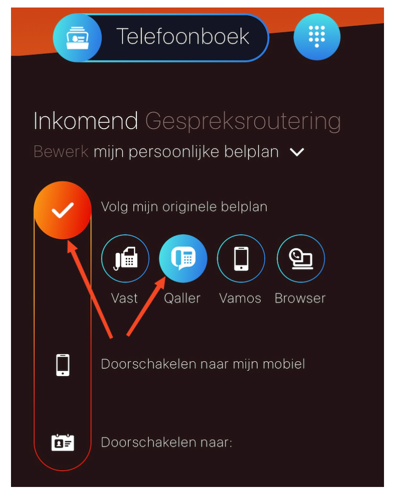 Open de Qaller app om te kijken of de instellingen juist staan ingesteld. Het is van belang dat het icoontje bij "Volg mijn originele belplan" geselecteerd is en het "Qaller" bolletje ingeschakeld is. Mocht één van beide niet geselecteerd zijn dan ontvang je geen inkomende oproepen.